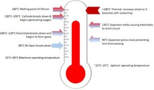 Khi nhiệt độ tăng trên 150°C–180°C, phản ứng có thể tự duy trì nếu pin không thể tản nhiệt nhanh chóng. Đây là thời điểm với cái tên huyền thoại “thermal runaway” vì quá trình tạo ra oxy khiến ngọn lửa tự duy trì – ít nhất là cho đến khi tất cả nhiên liệu đã cháy hết. Nếu khí tiếp tục tích tụ bên trong cell, cell có thể bị vỡ hoặc thoát ra ngoài qua van an toàn. Cell có thể bị vỡ hoặc thoát ra ngoài khí hydrocarbon dễ cháy và chất điện phân hydrofluorocarbon và tia lửa có thể đốt cháy chất điện phân và các khí dễ cháy gây ra ngọn lửa và có khả năng gây nổ.)