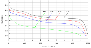 Trong đồ thị này, cell pin có dung lượng tối đa 2000mAh ở hệ số xả 0.2C. Khi tăng hệ số xả lên 2C, cell có dung lượng tối đa là 1800mAh, tức là dung lượng có khả năng sử dụng bị giảm xuống 10%.
