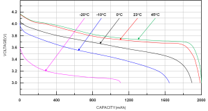 Việc hiểu rõ thiết bị hoạt động trong khoảng nhiệt độ nào là vô cùng quan trọng trong việc quyết định điện áp của pin. Nhiệt độ thực tế hoạt động ảnh hưởng tới hiệu quả phản ứng điện hóa trong pin: nhiệt cao làm tăng hệ số tự xả – một hiện tượng đặc trưng của li-ion. (phản ứng hóa học trong pin làm giảm mật độ năng lượng khả dụng mà pin không chịu tải nào hoặc không có sự tương tác gì giữa 2 điện cực). Ngược lại, nhiệt độ thấp làm giảm hệ số tự xả, bảo toàn năng lượng lưu trữ, nhưng chất điện phân lại hoạt động kém hơn trong điều kiện lạnh, vì vậy pin cũng yếu hơn. Trong cả hai trường hợp này, đều quan sát thấy điện áp phản ứng với tải xung giảm đi theo thời gian.